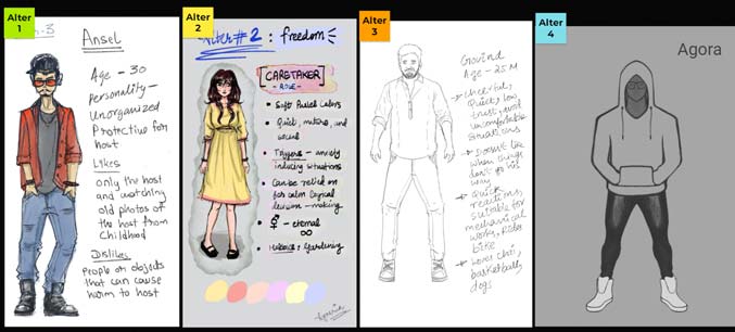 The player is unaware that Ansel (the protagonist) has D.I.D. at the start of the narrative. Even the alters are not aware of one another. Initially, the alters switch due to external triggers. The introduction of each alter takes place in Act 1 of the narrative. Every alter has suffered a loss, and these losses are all related. There are four alters: Agora, Govind, Freedom, and Ansel. In act 2, the alters become aware of one another and begin exchanging hints. Act 3 focuses more on self-realization and alters supporting one another in achieving their objectives.